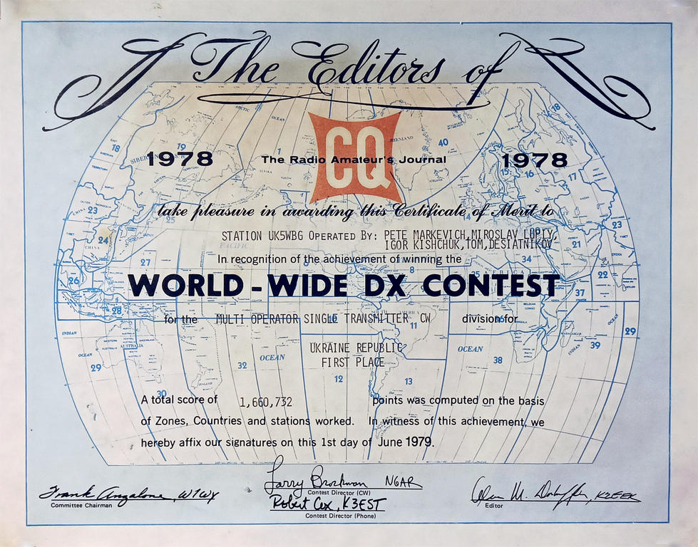 Можна навести лише кілька фактів з періоду 70-х років: ніхто в Ураїні не мав такого антенного господарста на КХ – 4 ел. QUAD на вч діапазони, окремий 6 ел. QUAD на 28 МГц, 1 ел. QUAD НА 7МГц, GP на 3,5 МГц. Використовуючи приймачі Р-250 разом з трансиверною привязкою на радіолампі ГУ-29, виміняною у колег-луганчан на лампу ГУ-43, яку тоді почали випускати у Львові на заводі “Полярон”. Заводські хлопці 5 років підряд поки не надокучило ставали чемпіонами України на КХ, залишаючи далеко позаду гонорових oператорів з UK5MAF i UK5IAZ.